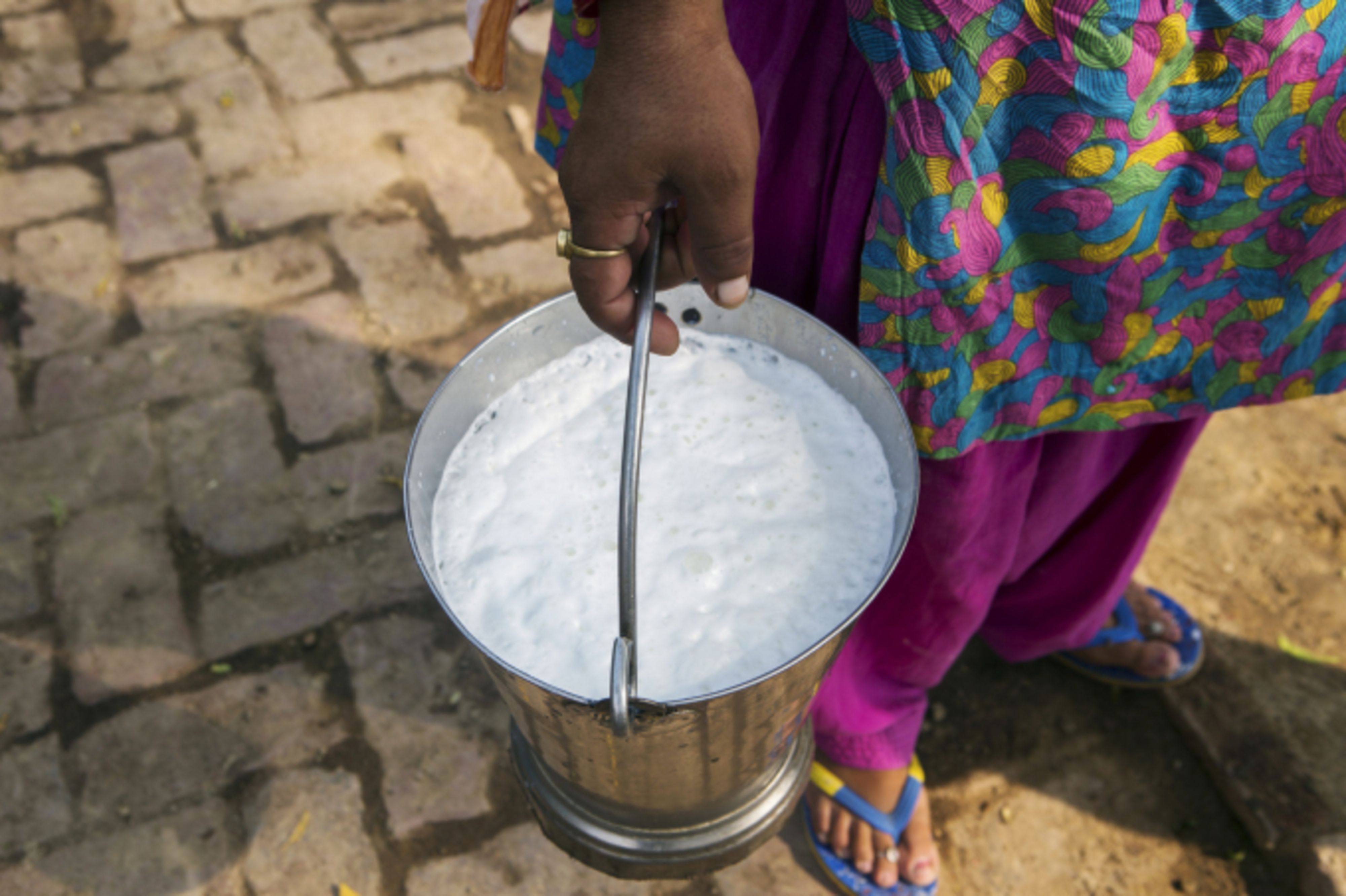 A woman carries a pail of milk. (Photographer: Prashanth Vishwanathan/Bloomberg)