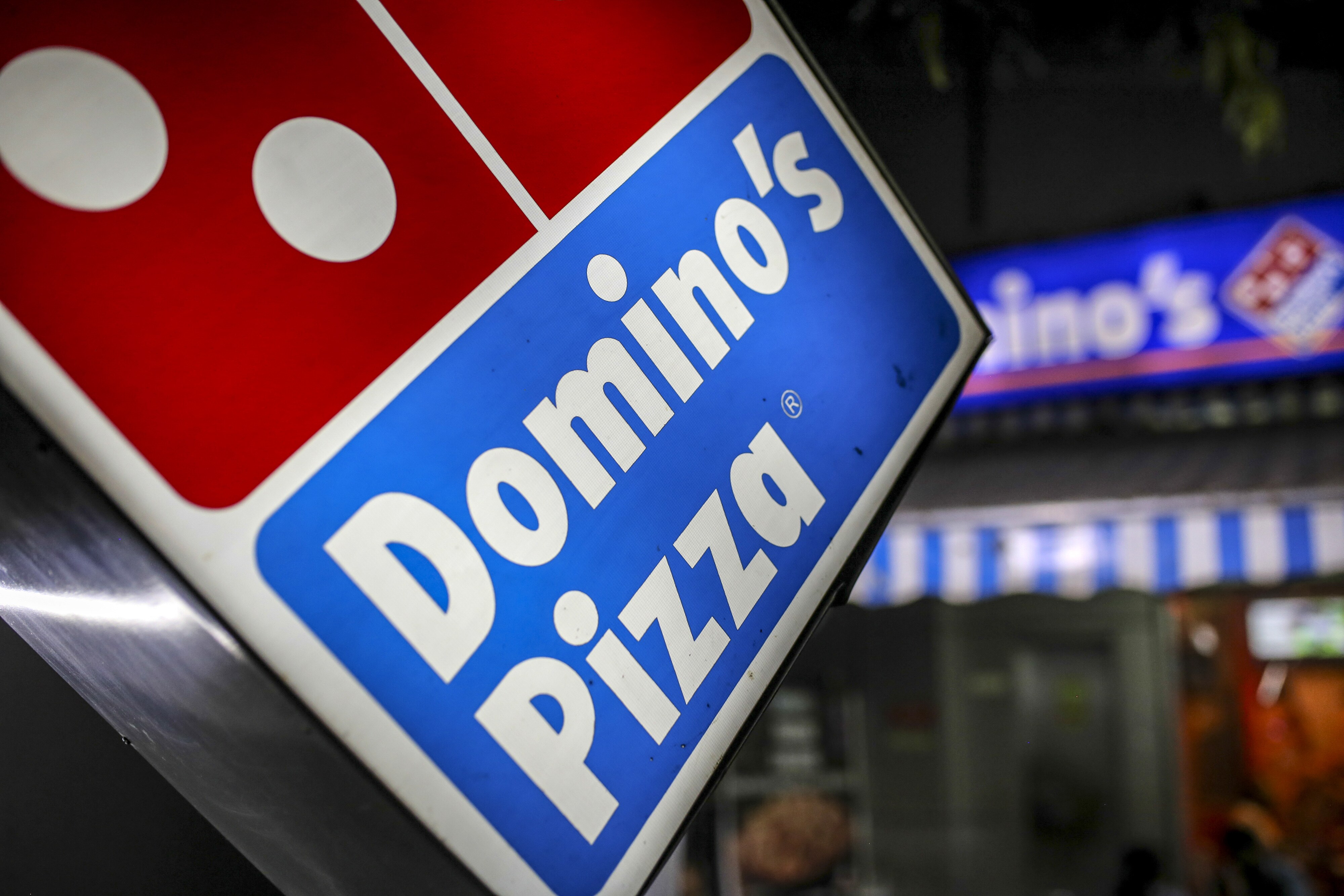 A sign for Domino’s Pizza is seen outside one of the company’s restaurant, operated by Jubilant Foodworks. (Photographer: Dhiraj Singh/Bloomberg)