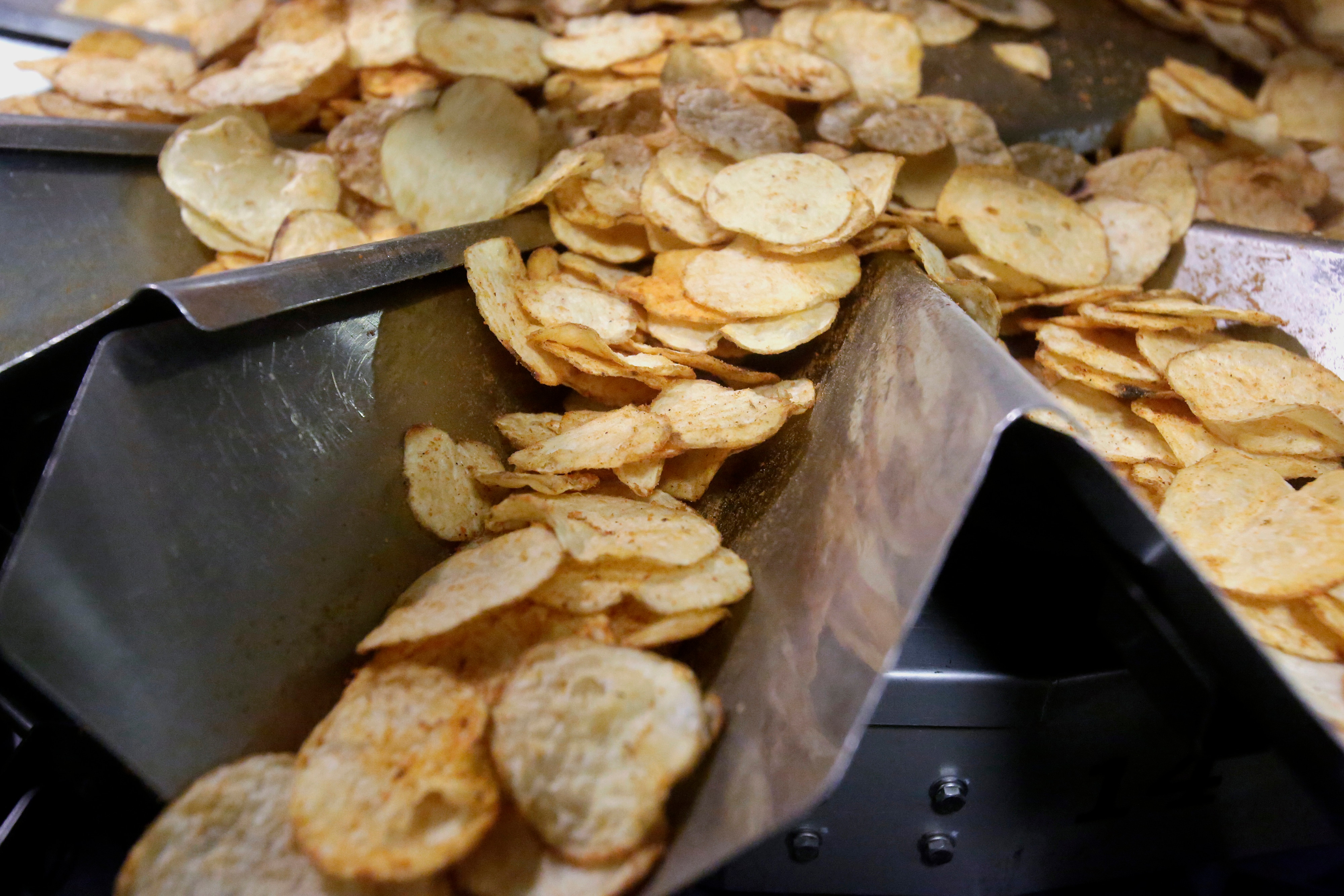 Potato chips are sorted for packaging after being seasoned at a production facility. (Photographer: Meg Roussos/Bloomberg)