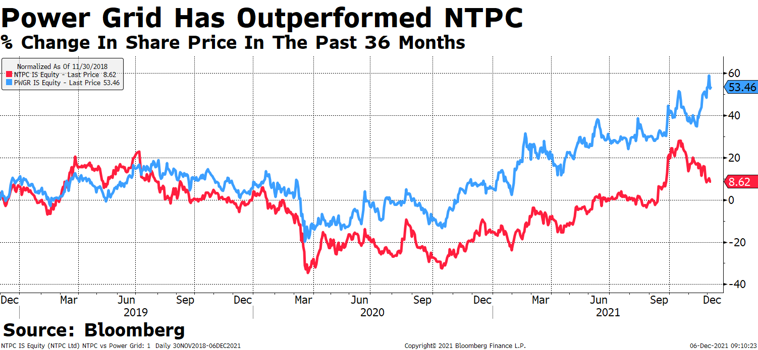 Domestic institutional investors' faith in NTPC remains firm, the brokerage said in a Nov. 30 report. That's when it has underperformed compared to Power Grid in the past few years. And NTPC is likely to face "significant disruption risks" from transition to clean energy even as Power Grid may benefit, Kotak said.
