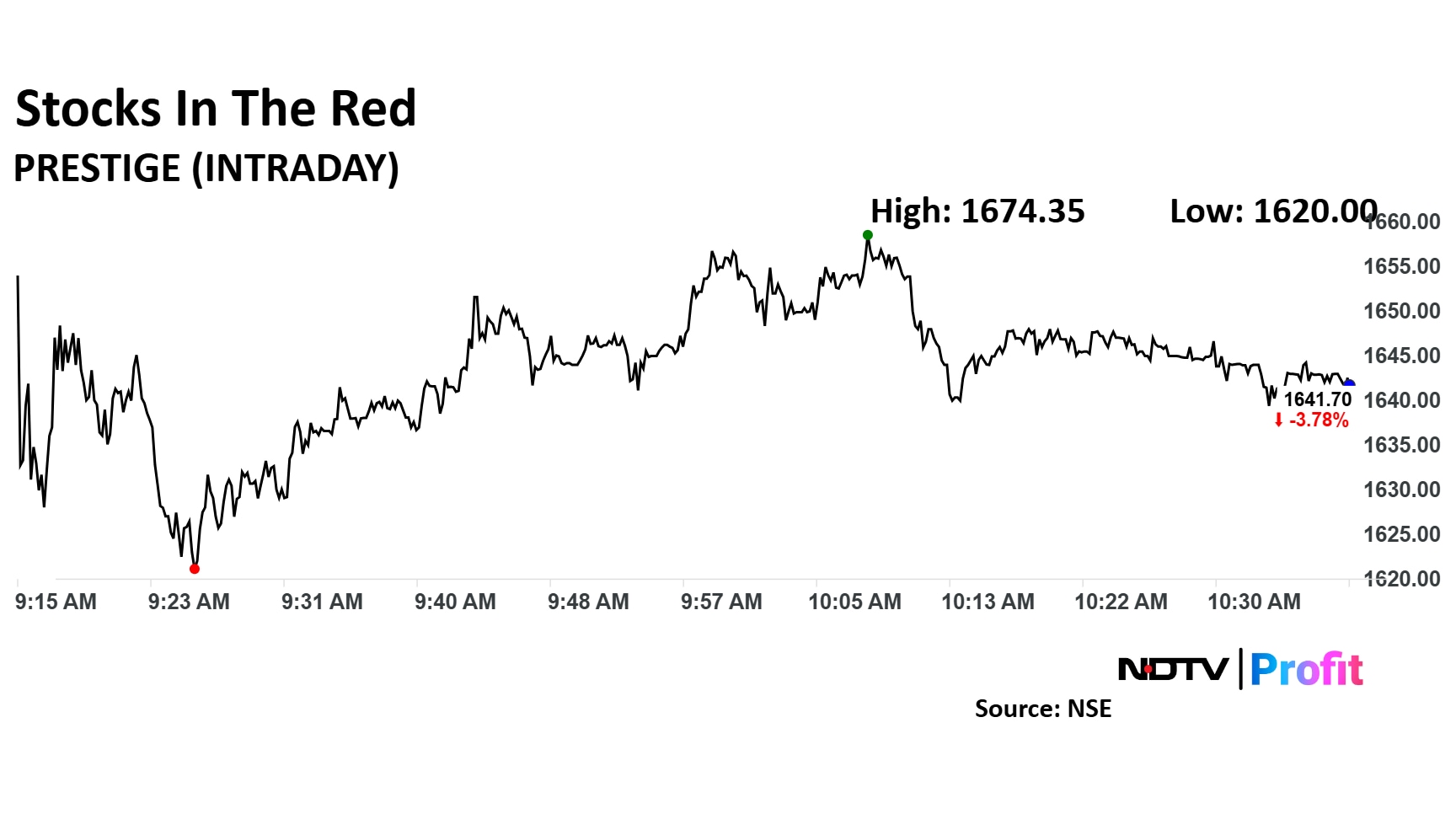 Share price of Prestige Estate fell as much as 5.05%, before paring loss to trade 3.75% lower at Rs 1,642.25 apiece, as of 10:44 a.m. This compares to a flat NSE Nifty 50.