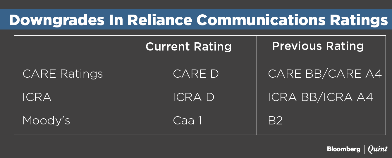CARE was the first rating agency to downgrade RCom's debt to default, followed by ICRA. International rating agency Moody's Investors Services downgraded RCom's corporate family rating and senior secured bond rating to ‘Caa1', that is speculative of poor standing or high credit risk, from ‘B2' and put their ratings under review for further downgrade.