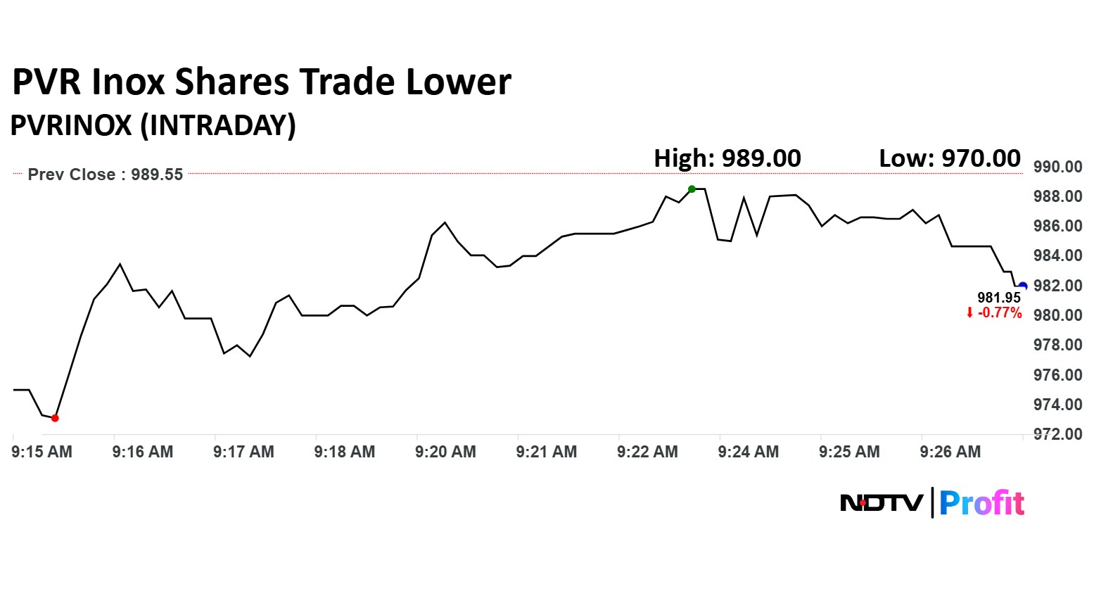 Shares of PVR Inox fell as much as 1.98% to Rs 970 apiece. They pared losses to trade 0.77% lower at Rs 989 apiece, as of 9:28 a.m. This compares to a 0.22% decline in the NSE Nifty 50.