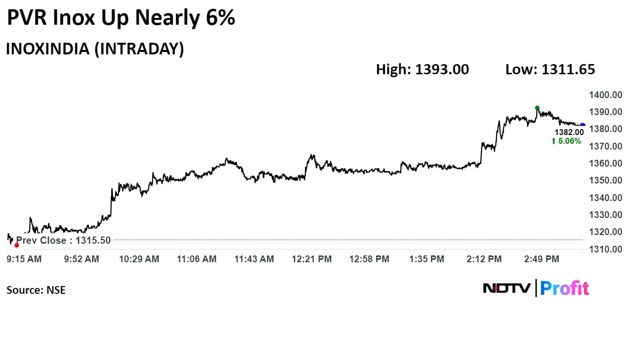 Shares of PVR Inox rose as much as 6% during the day to Rs 1,513 apiece on the NSE. It was trading 4.88% higher at Rs 1,496.85 apiece, compared to a 0.52% advance in the benchmark NSE Nifty 50 as of 3:23 p.m.