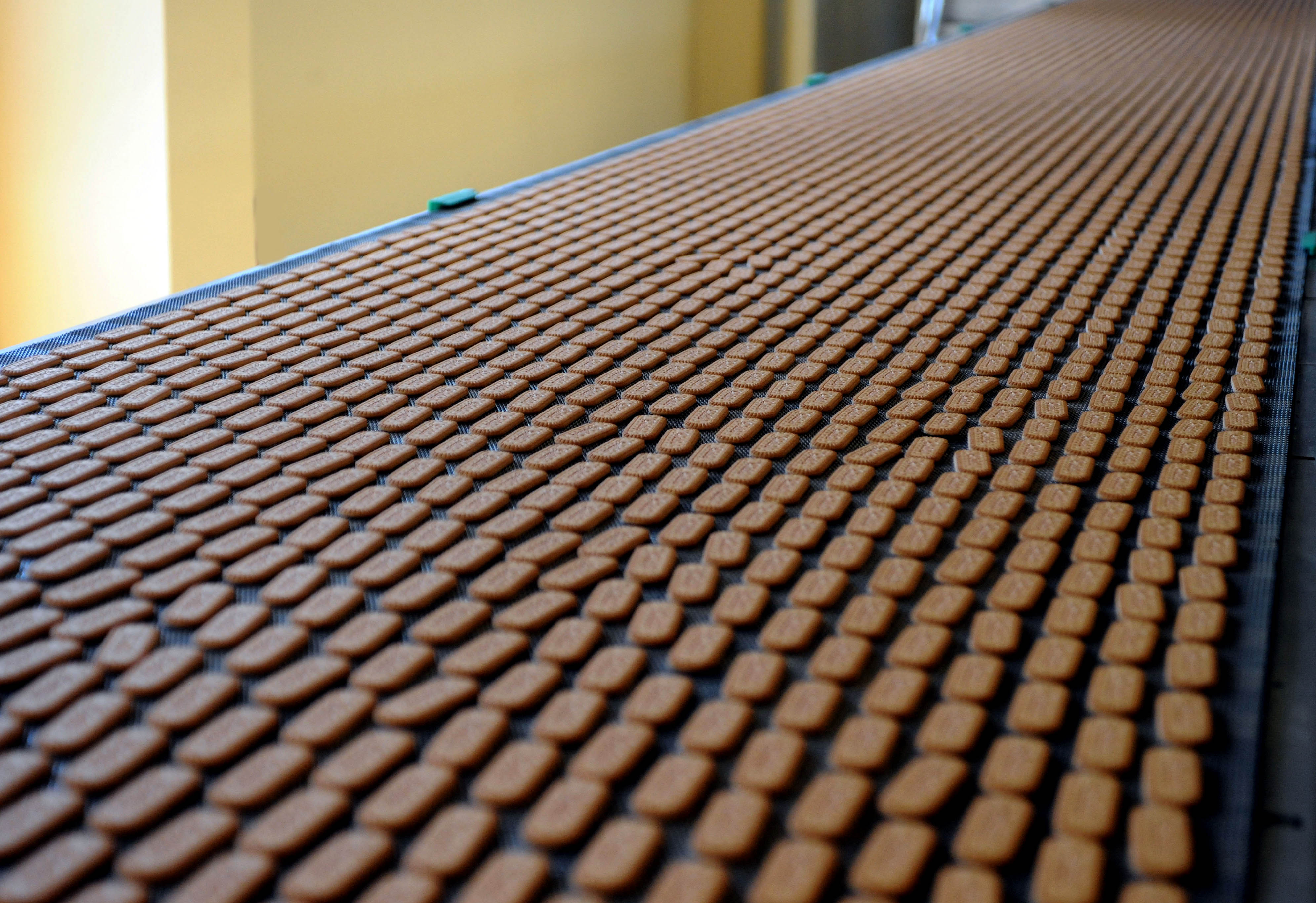 Biscuits move along a conveyor belt (Photographer: Chris Warde-Jones/Bloomberg News)