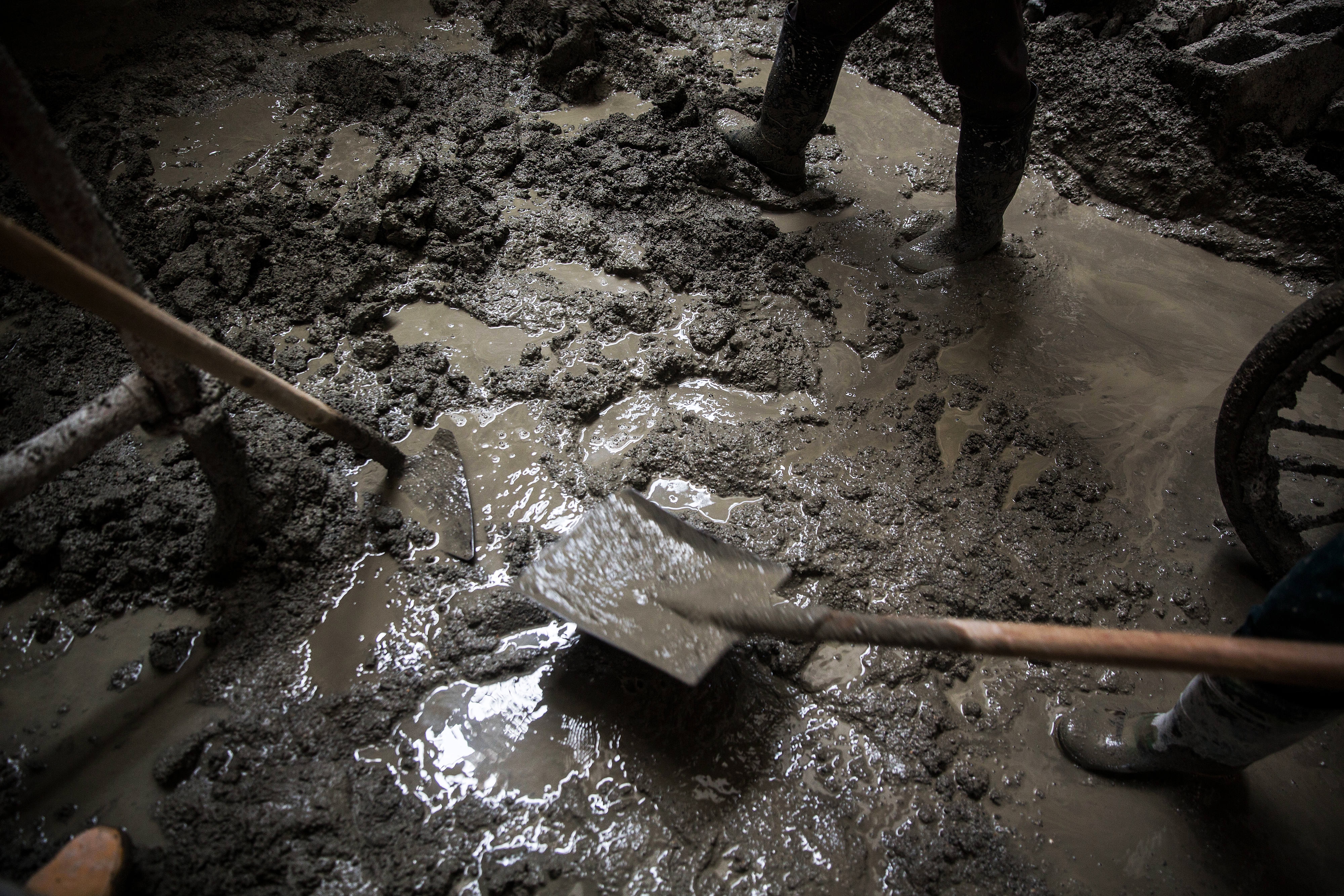 Workers prepare cement at a hydroelectric dam construction site in Laos. (Photographer: Taylor Weidman/Bloomberg)