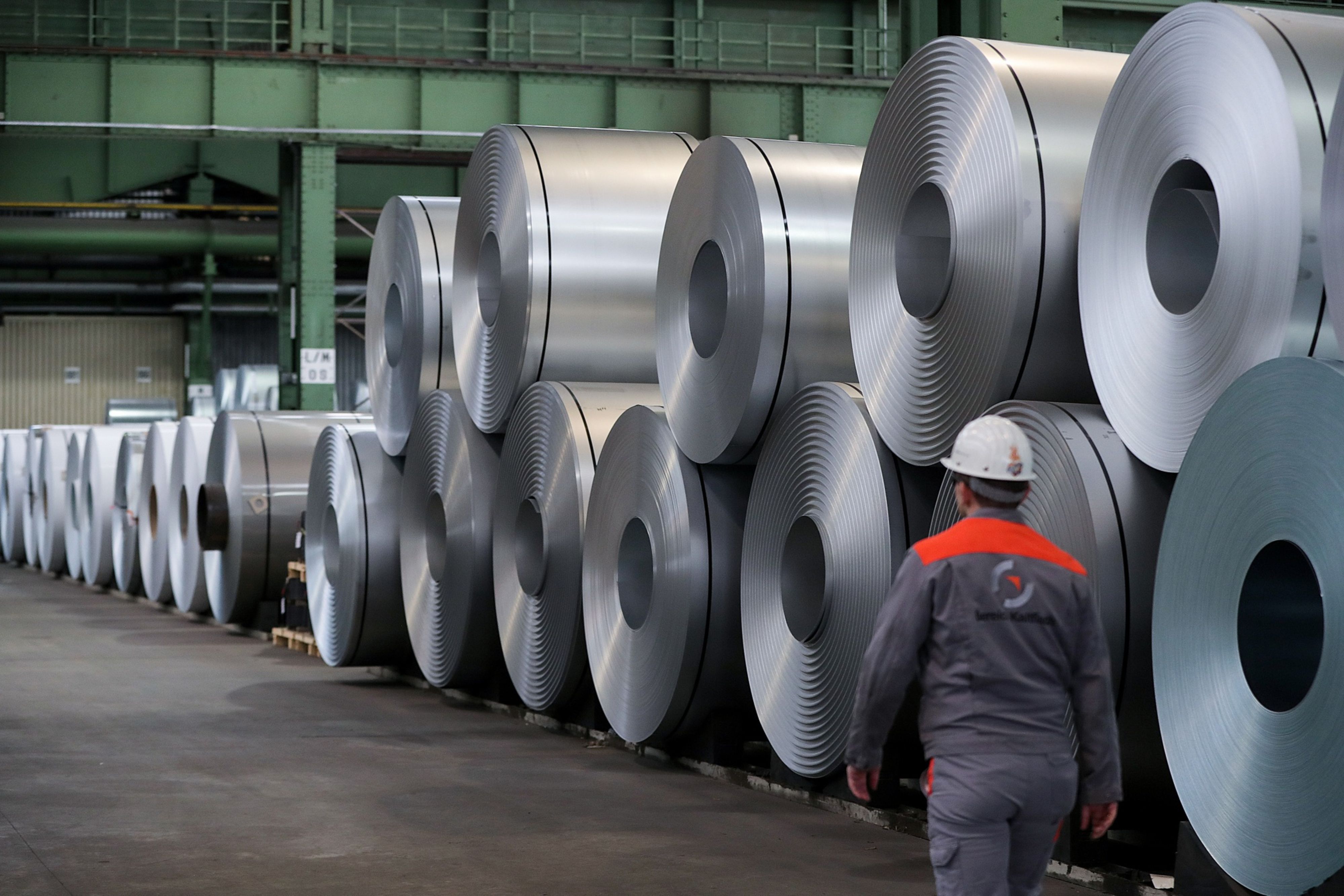 An employee passes rolls of steel in storage. (Photographer: Krisztian Bocsi/Bloomberg)