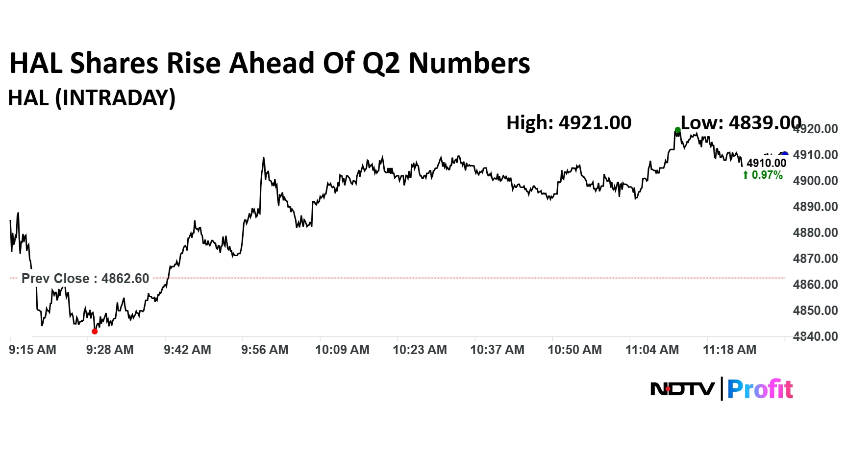 Shares of defence-major Hindustan Aeronautics were trading marginally higher ahead of the company's Q2 results announcement on Wednesday. HAL's shares were up nearly 1% at Rs 4,910.90 apiece, as of 11:30 a.m.