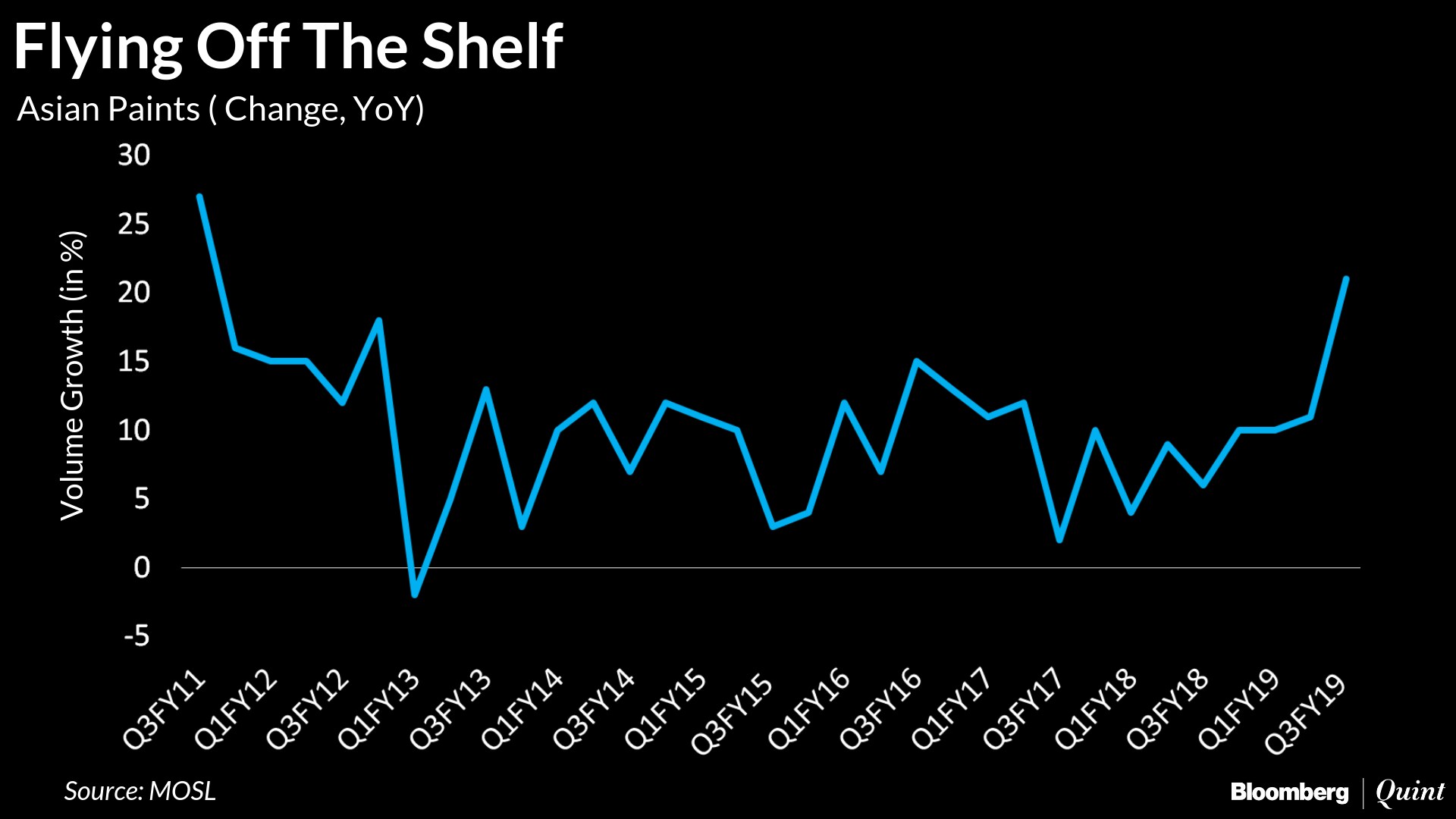 Asian Paints' volume in the domestic decorative business grew at its fastest pace in nearly 8 years in the third quarter. The company reported a 21 percent growth in volumes, the highest since December 2010, according to Motilal Oswal. This is also the fourth straight quarter of double-digit growth in volumes.