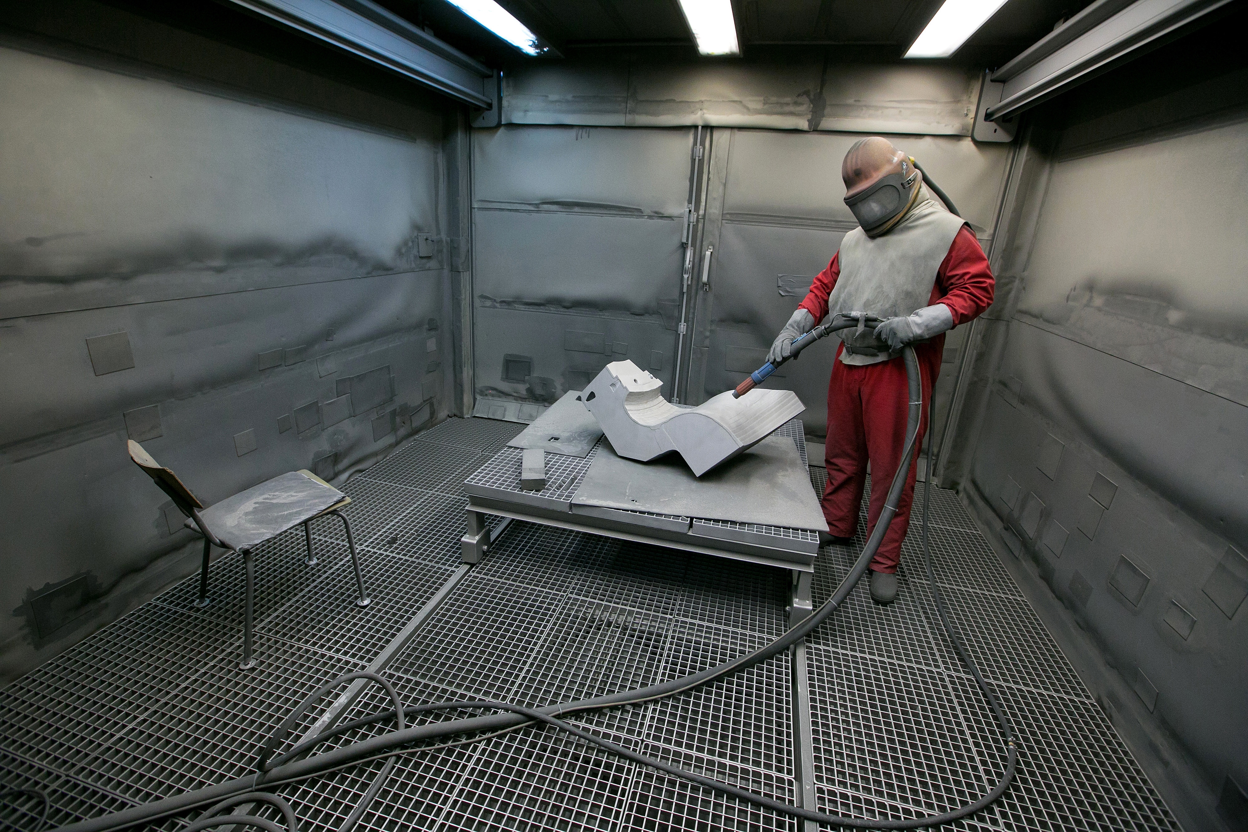 A worker prepares to blast steel grit from a hose in the dry abrasive blasting facility. (Photographer: Krisztian Bocsi/Bloomberg)