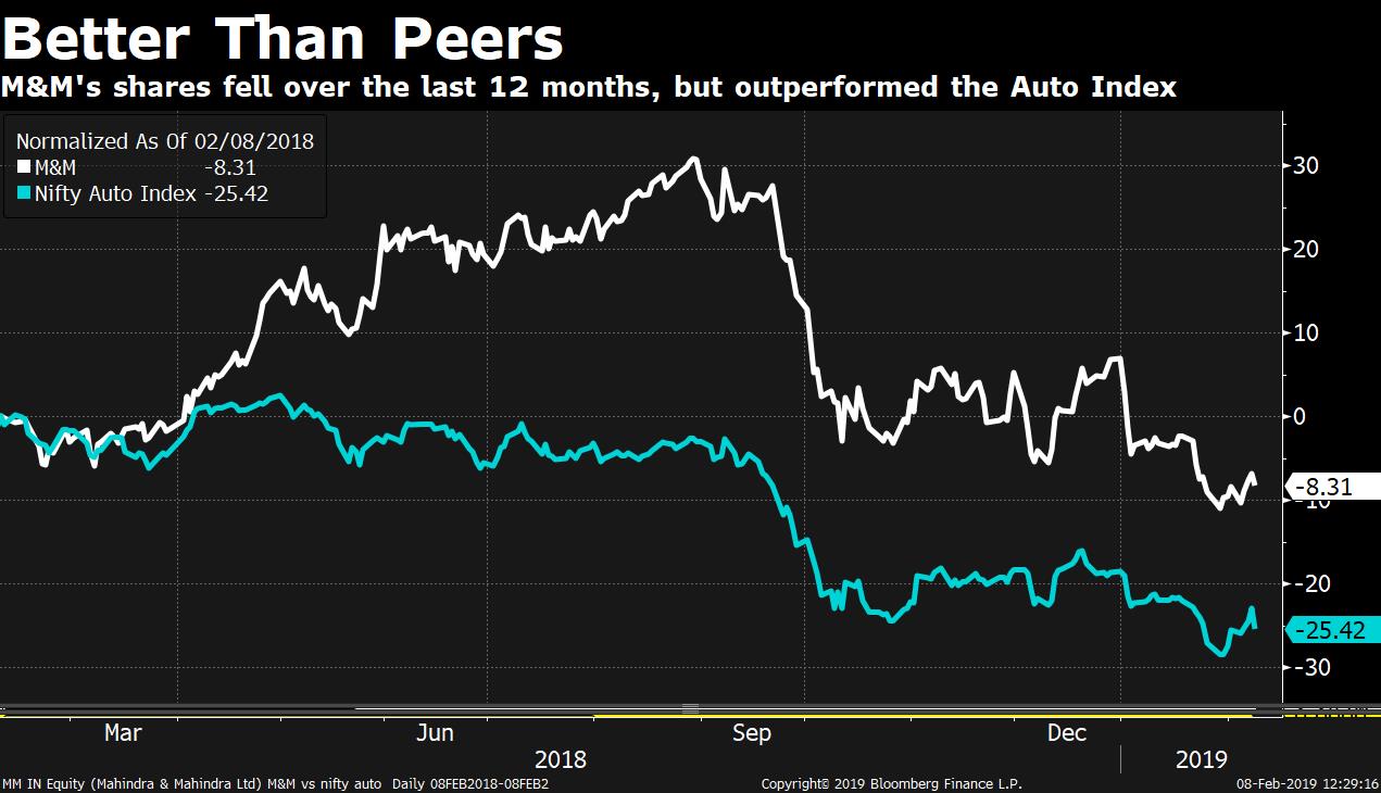 Shares of the automaker fell as much as 2.9 percent after the earnings announcement compared with a 2.83 percent decline in the Nifty Auto Index. Mahindra & Mahindra has fallen 8.21 percent over the last 12 months compared with a 25.33 percent decline in the auto benchmark, faring better than most of its peers.