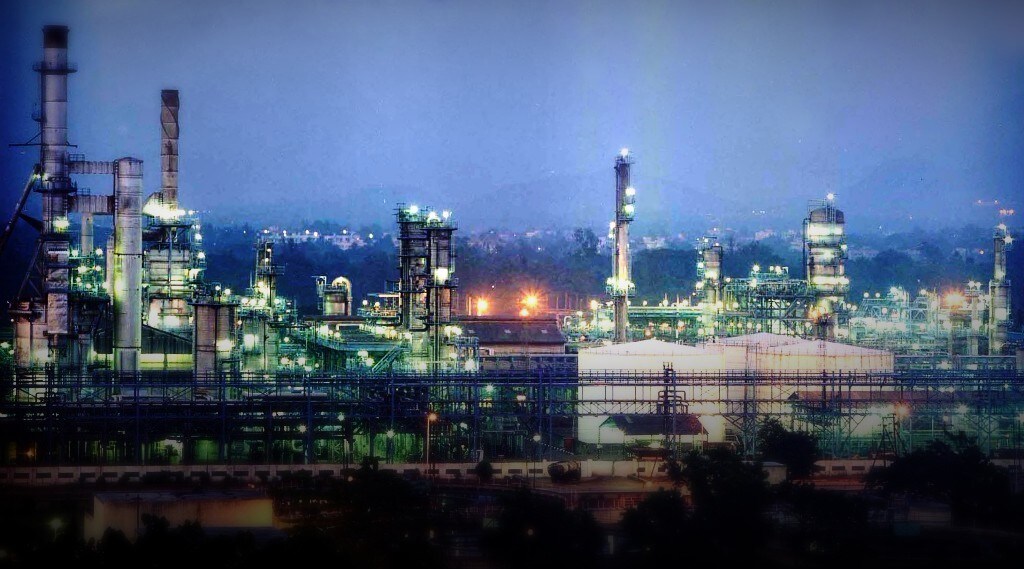 A Reliance Industries Ltd. petrochemical plant is pictured at night in Jamnagar, Gujarat, India (Photographer: Rajan Chaughule/Bloomberg News.)