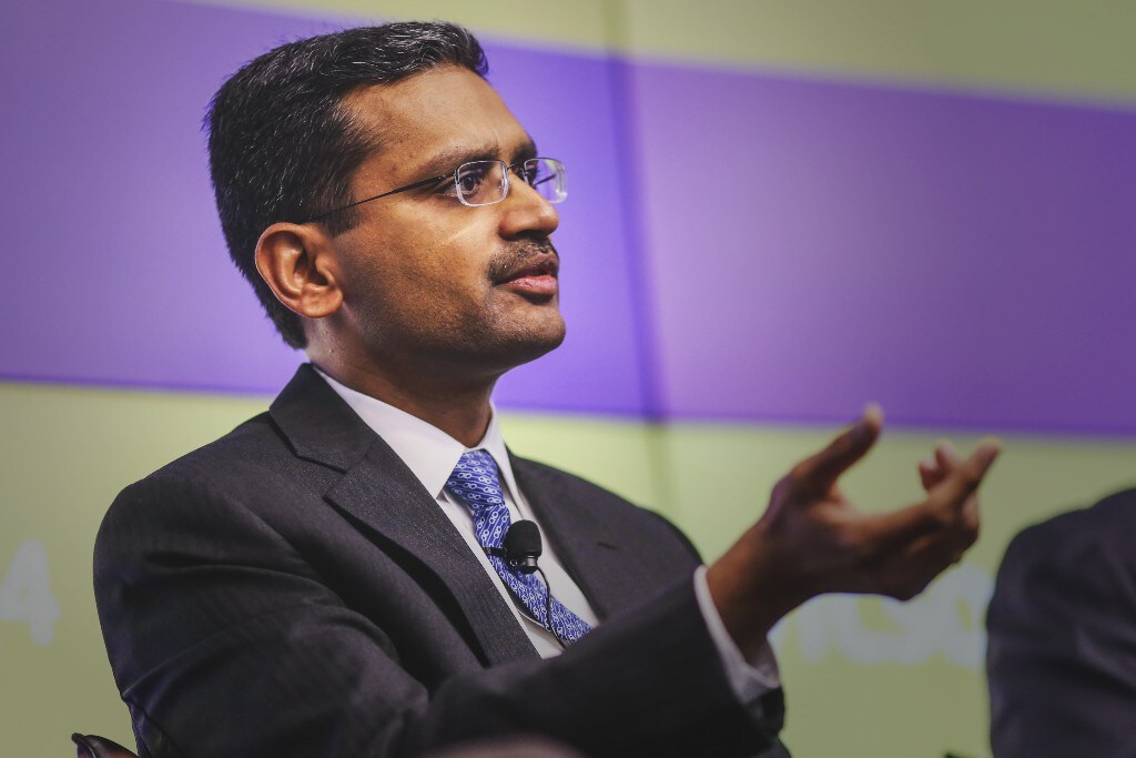 Rajesh Gopinathan, chief executive officer of Tata Consultancy Services, gestures as he speaks during a news conference in Mumbai, India (Photographer: Dhiraj Singh/Bloomberg)