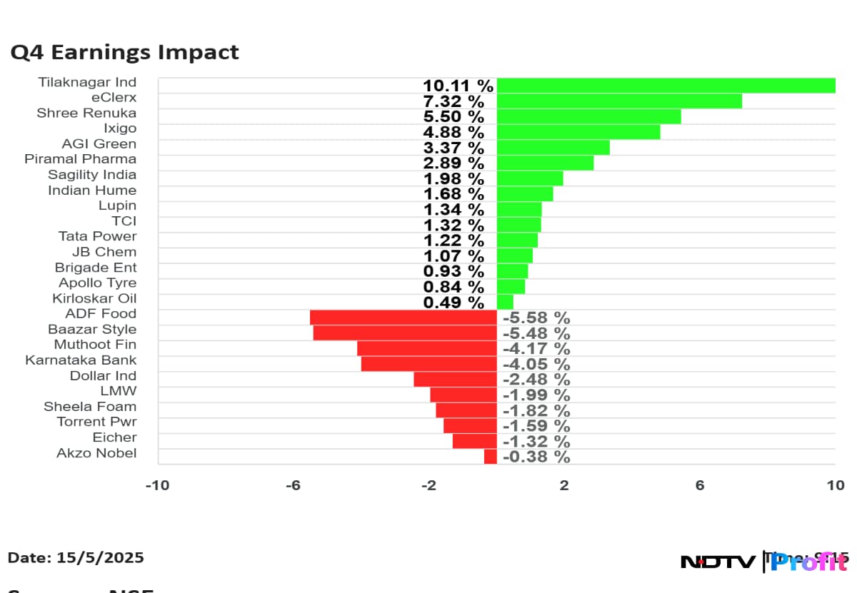 Tilaknagar Industries Ltd. shares rose the most, while Baazar Style Ltd. fell the most, among the companies that announced their results for quarter ended March.