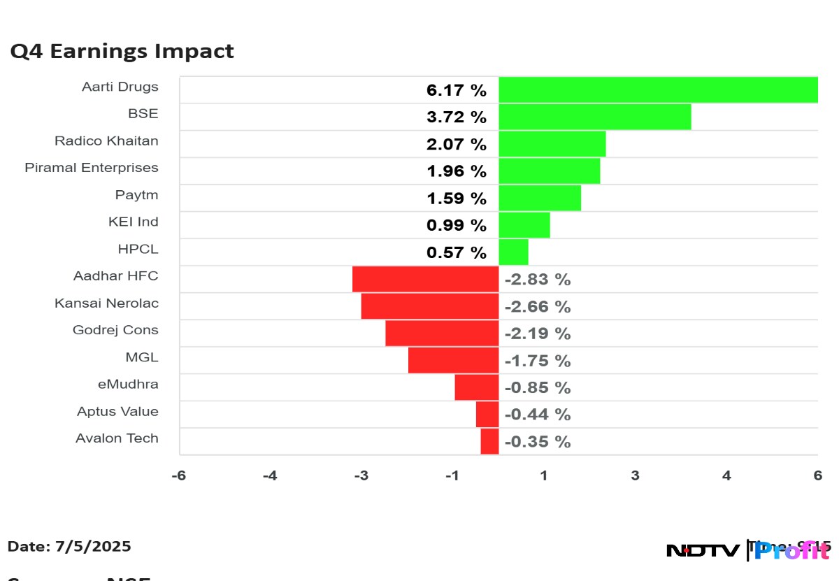 Aarti Drugs Ltd. shares rose the most, while Aadhar Housing Finance Ltd. fell the most, among the companies that announced their results for quarter ended March.