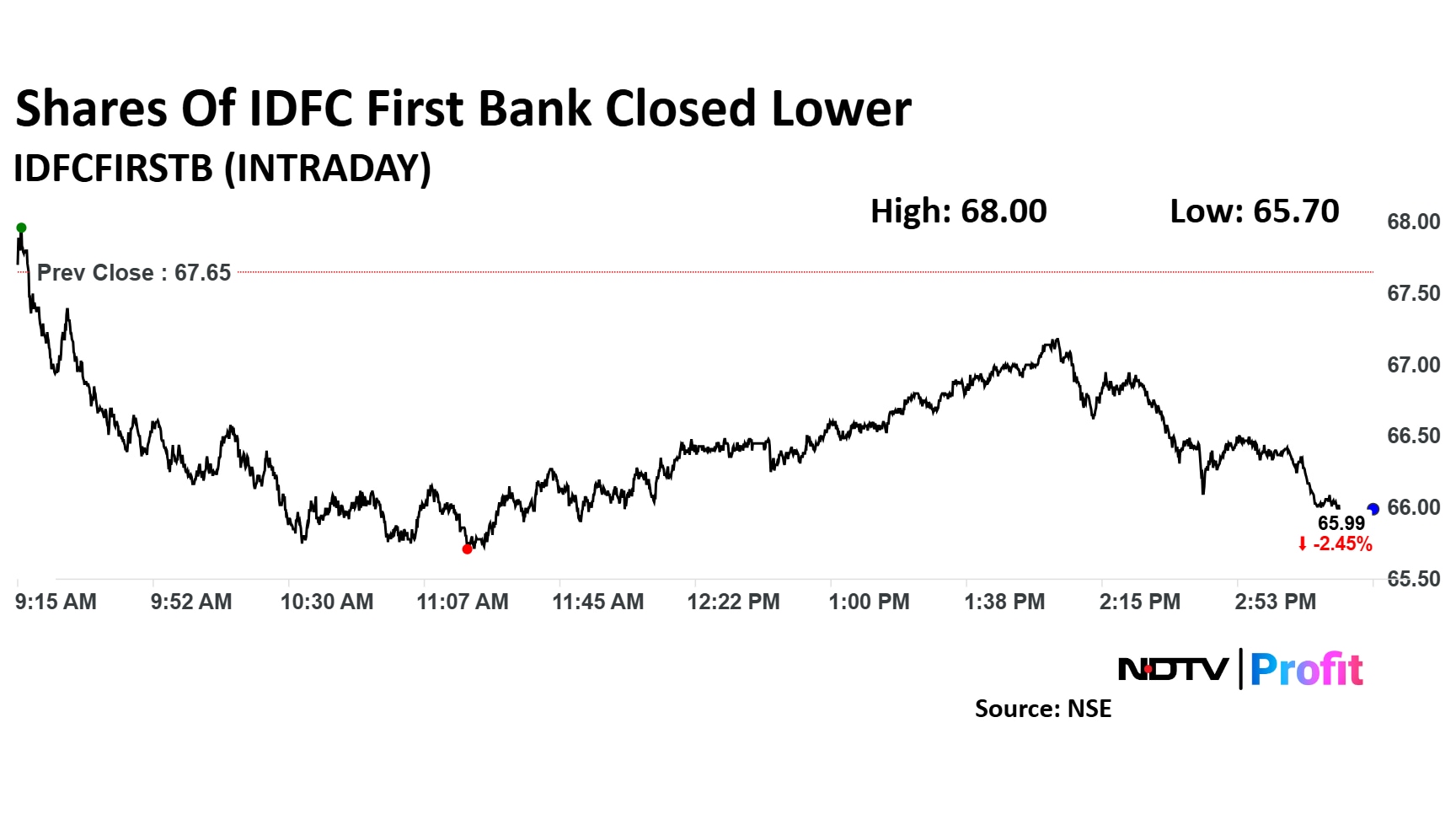The shares of IDFC First Bank closed 2.32% lower at Rs 66.08 on Friday ahead of posting results. The decline compares to a 0.86% decline in the benchmark index Nifty 50.
