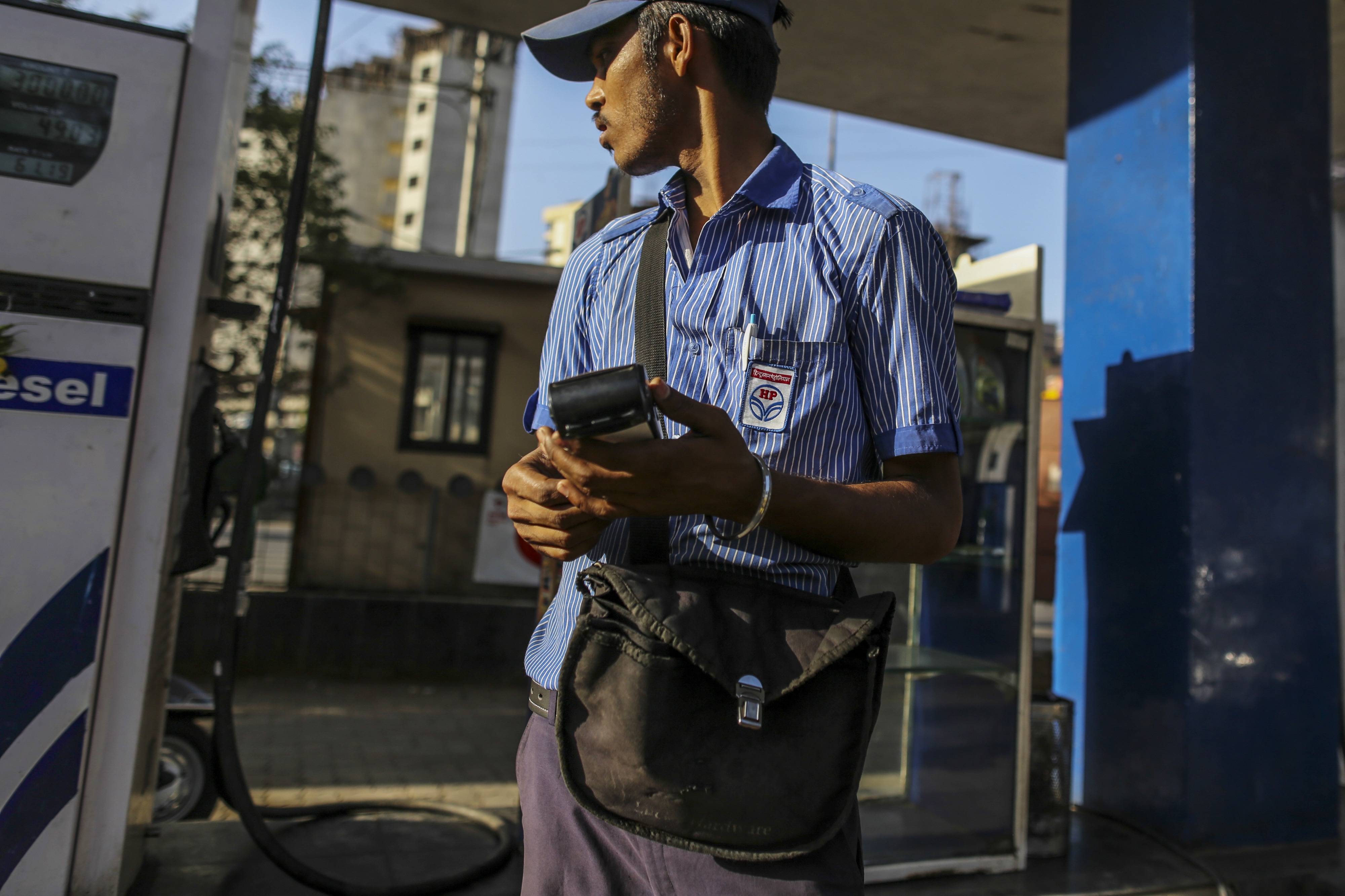 A worker holds an electronic payment terminal at a Hindustan Petroleum Corporation Ltd. gas station in Mumbai. (Photographer: Dhiraj Singh/Bloomberg)