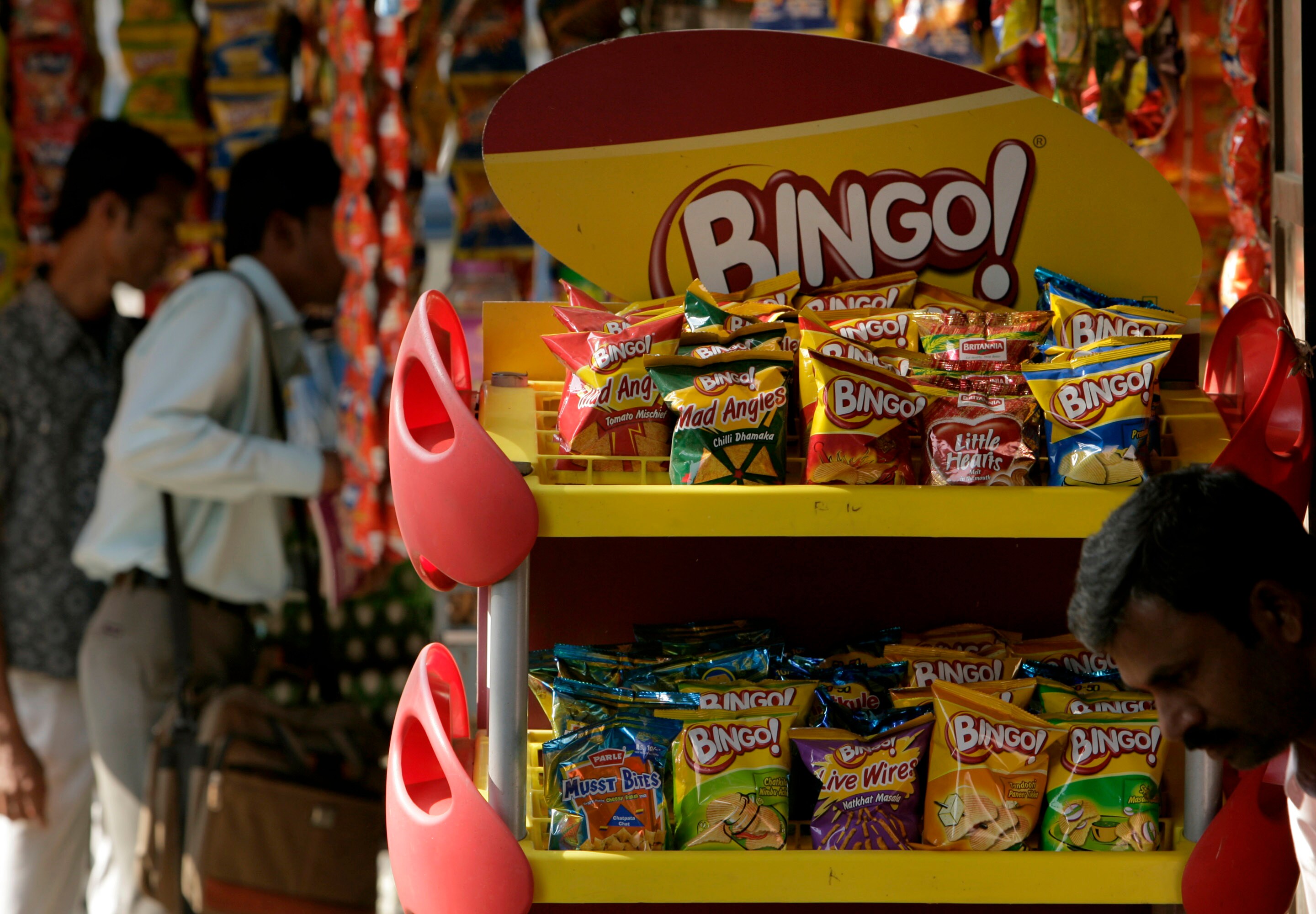Bingo wafers, made by ITC Ltd., sit for sale at a shop in Mumbai. (Photographer: Adeel Halim/Bloomberg News)