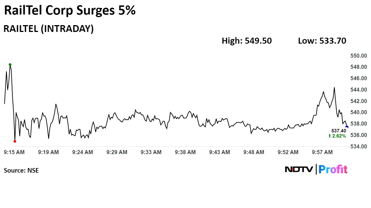Shares of RailTel Corp. of India Ltd. rose as much as 4.93% during the day to Rs 549.50 apiece on the NSE. It was trading 3.53% higher at Rs 542 apiece, compared to a 0.15% decline in the benchmark NSE Nifty 50 as of 10:01 a.m.