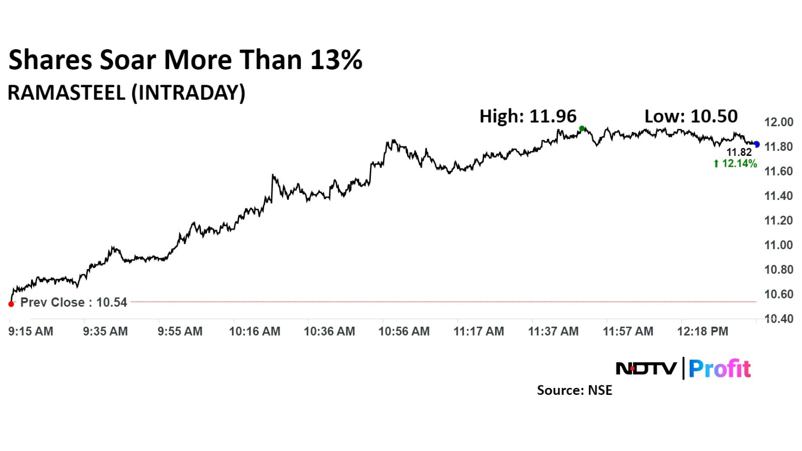 Shares of Rama Steel rose as much as 13.47% to Rs 11.96 apiece, the highest level since Aug. 1. The stock pared gains to trade 12.71% higher at Rs 11.88 apiece, as of 12:41 p.m. This compares to a 0.48% decline in the NSE Nifty 50 index.
