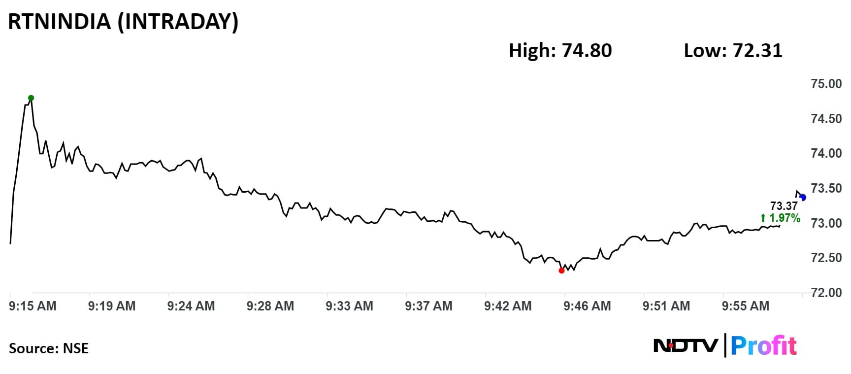 Shares of RattanIndia rose as much as 2.85% before paring gains to trade 0.25% higher at Rs 72.20 apiece at 09:55 a.m., compared to a 1.25% advance in the NSE Nifty 50.