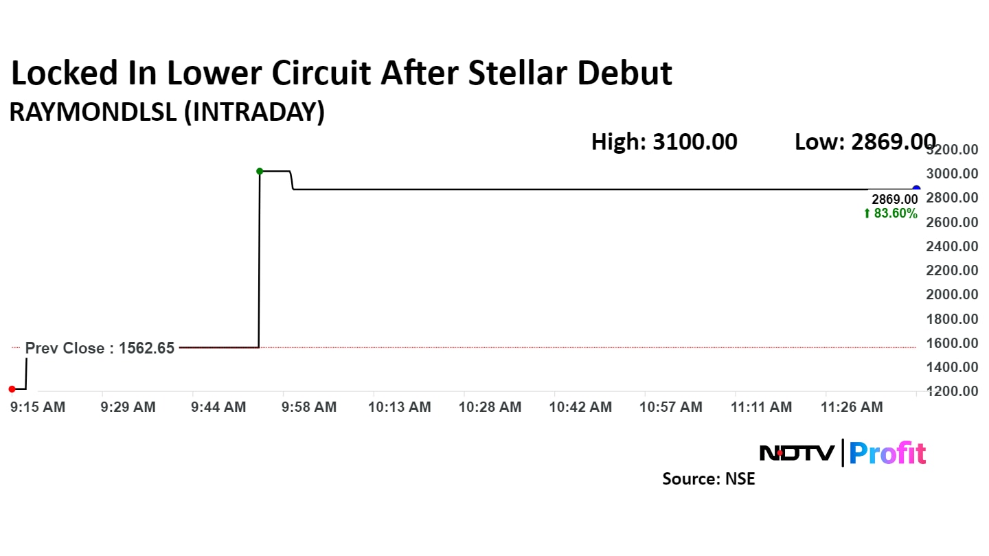 Raymond Lifestyle Ltd. was locked in a 5% lower circuit after a stellar market debut on Thursday. Shares of the company listed on the BSE on Thursday at Rs 3,000 apiece, a premium of 99.5% over its base price of Rs 1,503.3 per share. On the National Stock Exchange, the Raymond Lifestyle stock debuted at Rs 3,020 per share, marking a premium of 93% against the base price of Rs 1,562.6 per share.