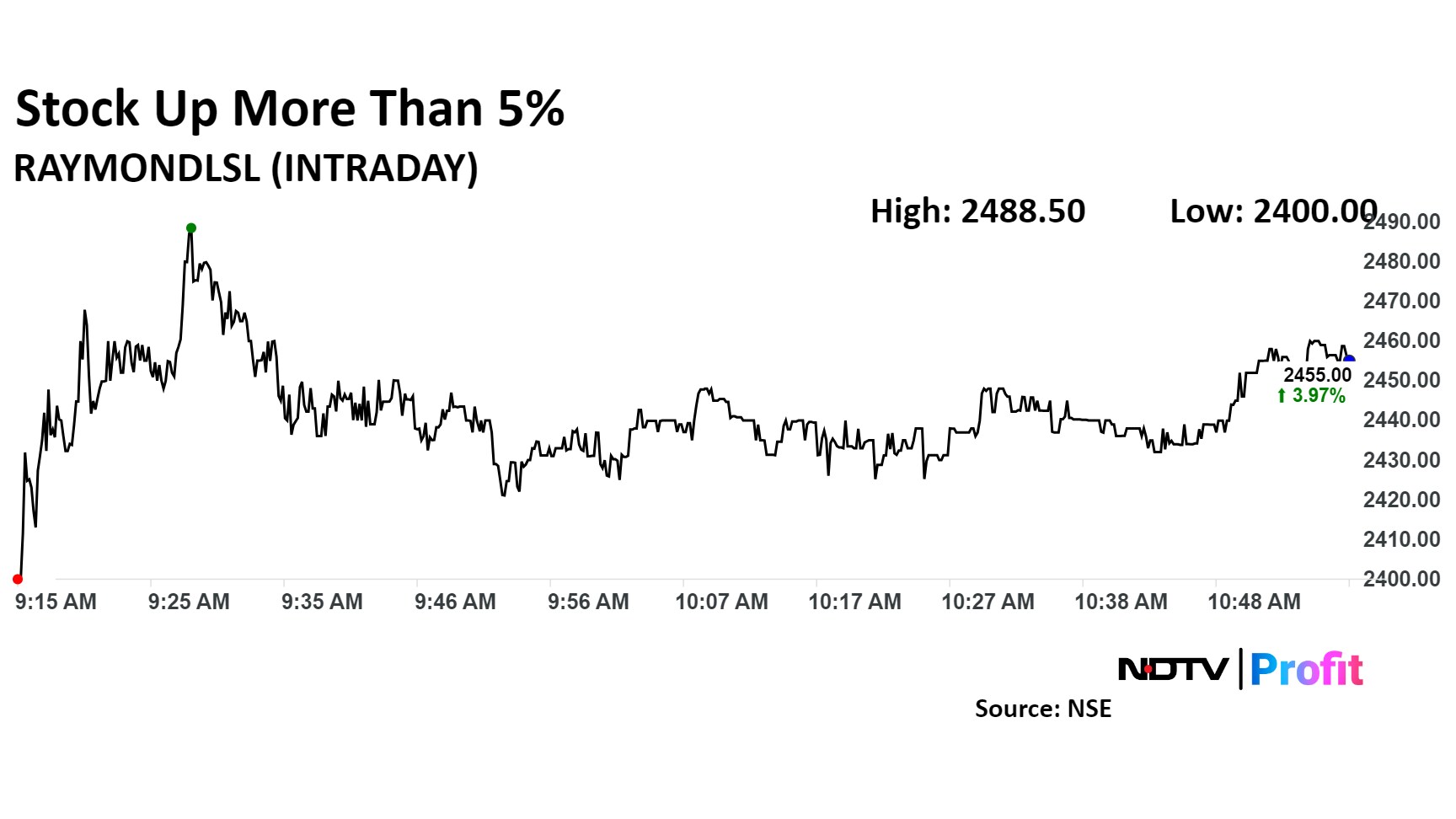 Shares of Raymond Lifestyle rose as much as 5.39% to Rs 2,488.50 apiece. It pared gains to trade 3.94% higher at Rs 2,454.45 apiece as of 10:56 a.m. This compares to a 0.10% decline in the NSE Nifty 50 Index.