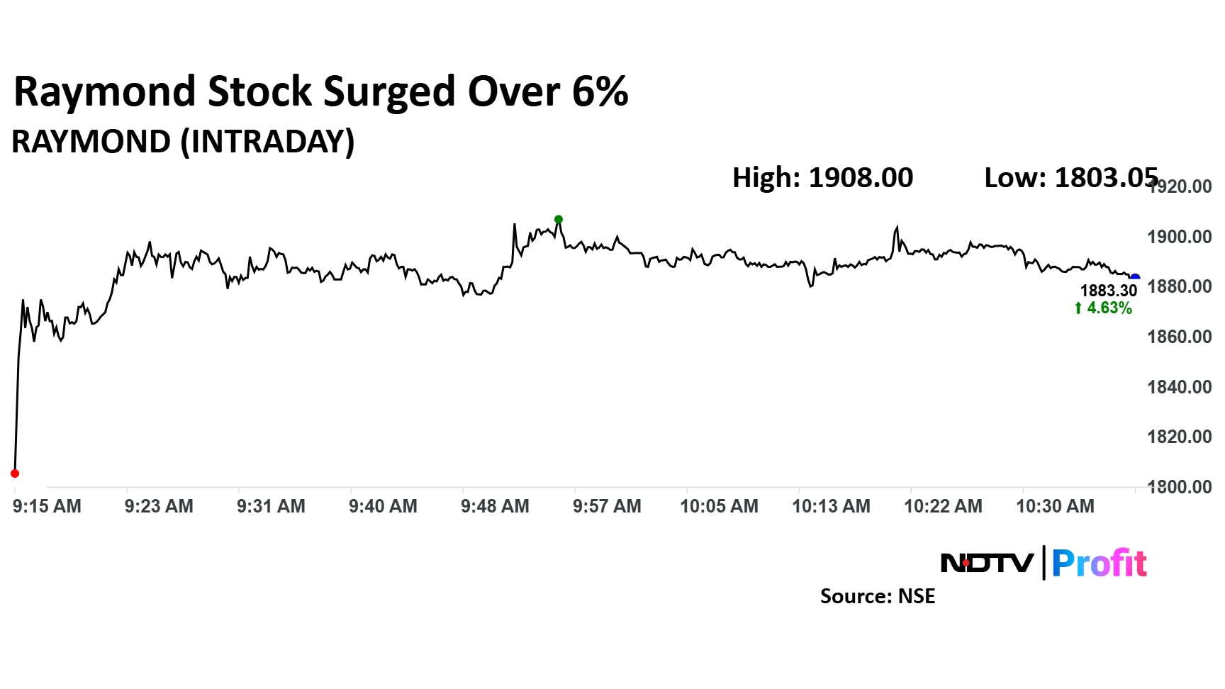Raymond share price rose as much as 6.02% to Rs 1,908.35 apiece. It pared gains to trade 4.54% higher at Rs 1,881.60 apiece, as of 10:44 a.m. This compares to a 0.26% advance in the NSE Nifty 50 Index.