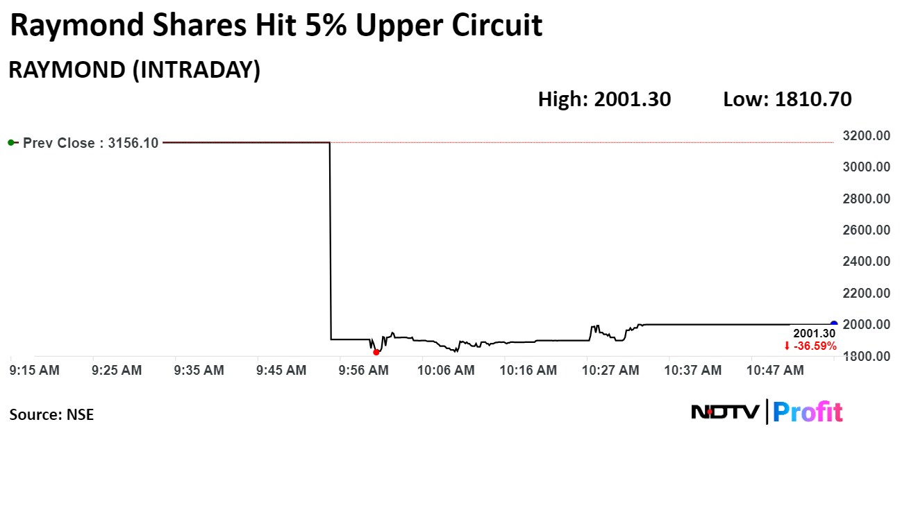 Raymond's stock rose as much as 5% to hit an upper circuit of Rs 2,001.30 per share on NSE. Thursday's rise is compared to the discovery price of Rs 1,906 apiece, as the realty arm was demerged on the day. This compares to a 0.32% decline in the benchmark NSE Nifty 50 as of 10:59 a.m. The shares earlier hit a 5% lower circuit at Rs 1,810.7 apiece.
