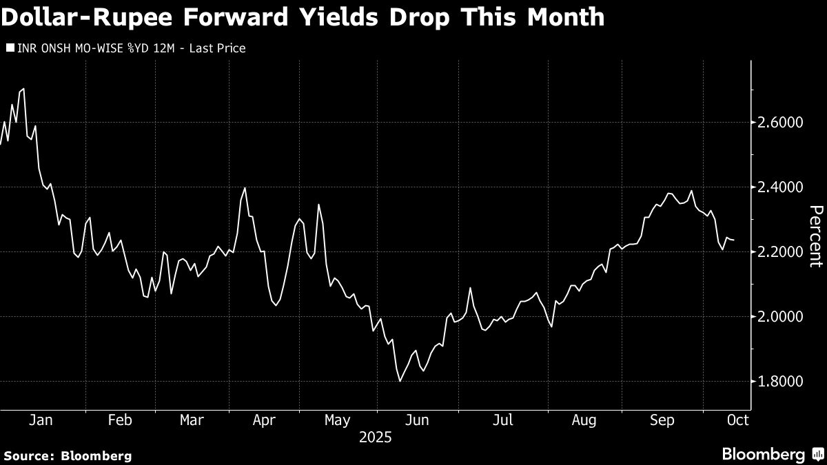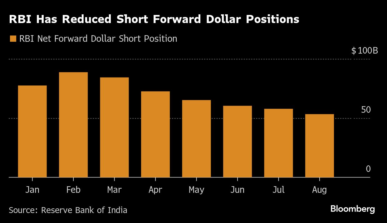 The swaps come after six months of reductions in such positions by the central bank. The authority's net short dollar book was at $53.4 billion in August, down from a record high of $88.8 billion in February, according to Bloomberg calculations based on RBI data.