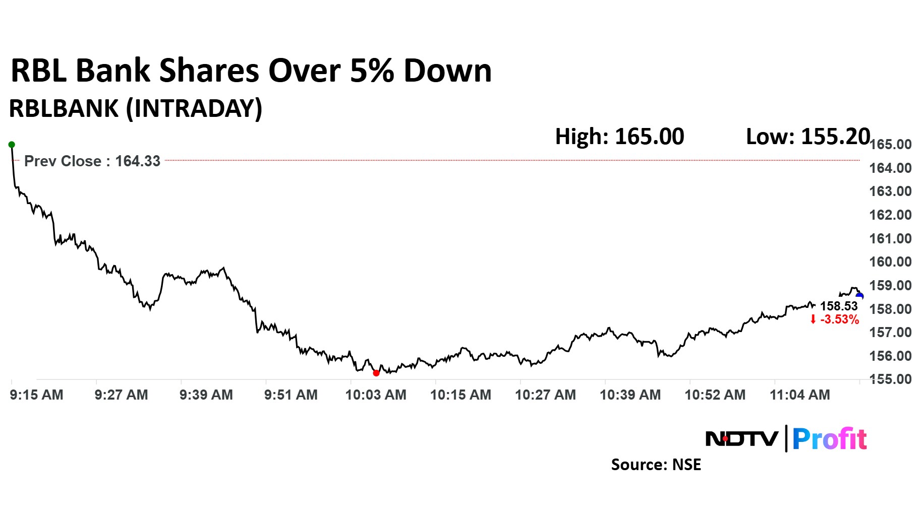 Share price of RBL Bank fell as much as 5.56% to Rs 155.20 apiece, the lowest level since Dec. 2. It pared losses to trade 3.64% lower at Rs 158.35 apiece, as of 11:13 a.m. This compares to a 0.07% advance in the NSE Nifty 50.