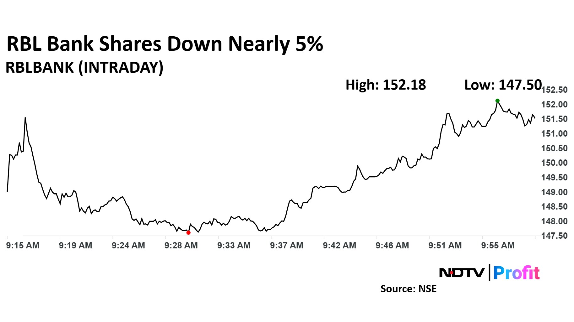 Share price of RBL Bank fell as much as 4.83% to Rs 147.50 apiece, the lowest level since May 26, 2023. It pared losses to trade 2.26% lower at Rs 151.48 apiece, as of 10:01 a.m. This compares to a 0.03% advance in the NSE Nifty 50.