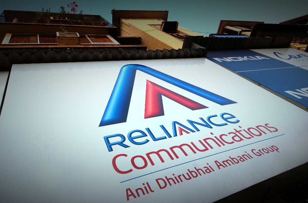 A logo hangs above a Reliance Communications Ltd. shop in Mumbai, India. (Photographer: Abhijit Bhatlekar/Bloomberg)
