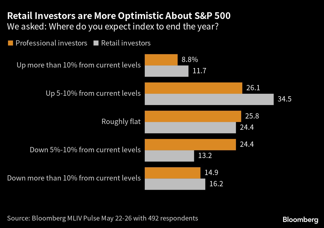 Retail investors were more likely than Wall Street to choose equities as the asset best positioned over the next year. Both groups were roughly split down the middle on whether Treasury yields will be higher or lower a month from now, highlighting the lack of clarity.