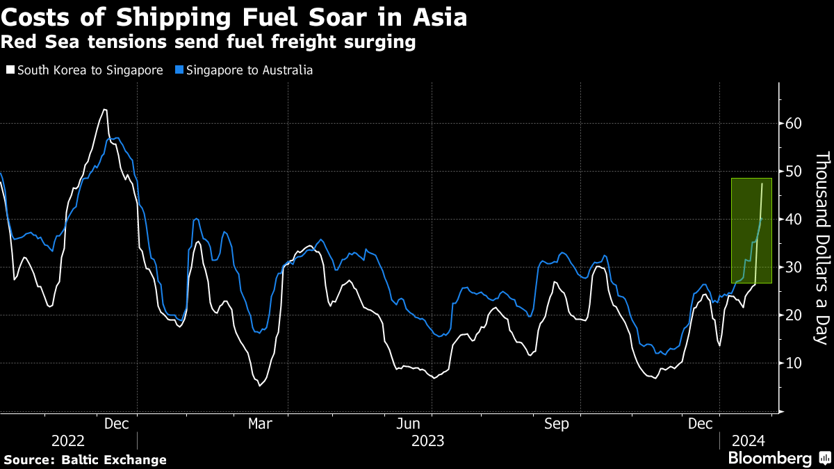 (Bloomberg) -- The Red Sea shipping crisis is sending waves through Asia's fuel markets, hoisting costs even on routes that don't use the waterway, while spurring sellers to reduce cargo premiums to offset the higher freight.