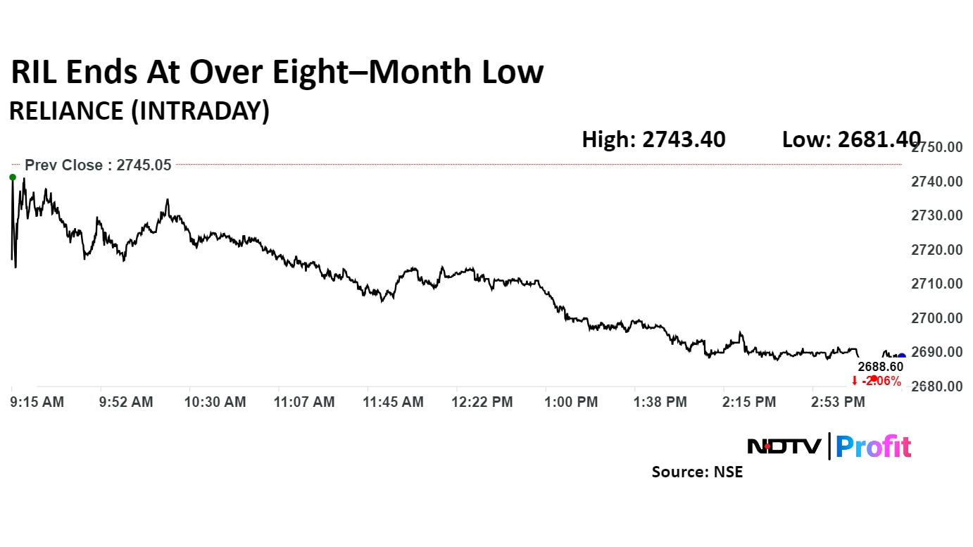 The share price of RIL declined 2.32% to Rs 2,687.25, the lowest level since Jan. 25, 2024. The stock ended 2.08% down at 2,688.05, the lowest closing level since Jan. 24. RIL shares snapped a two-day winning streak on Tuesday.