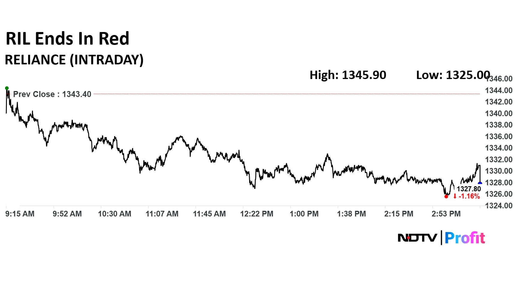 The stock of Reliance Industries Ltd. ended over 1% lower at Rs 1,327.80 apiece on the NSE ahead of its fourth quarter results on Friday.