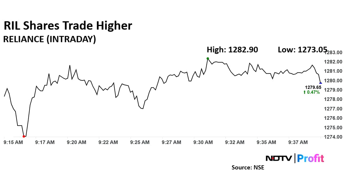 RIL's stock rose as much as 0.72% during the day to Rs 1,282.9 apiece on the NSE. It was trading 0.53% higher at Rs 1,280 apiece, compared to a 0.28% advance in the benchmark Nifty 50 as of 09:34 a.m.