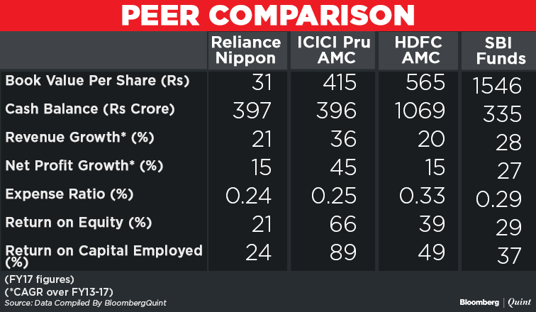 Reliance Nippon has no listed peers. In the unlisted space, there are 41 active asset management companies, including private and public players. Reliance Nippon lags behind the top players on most parameters.