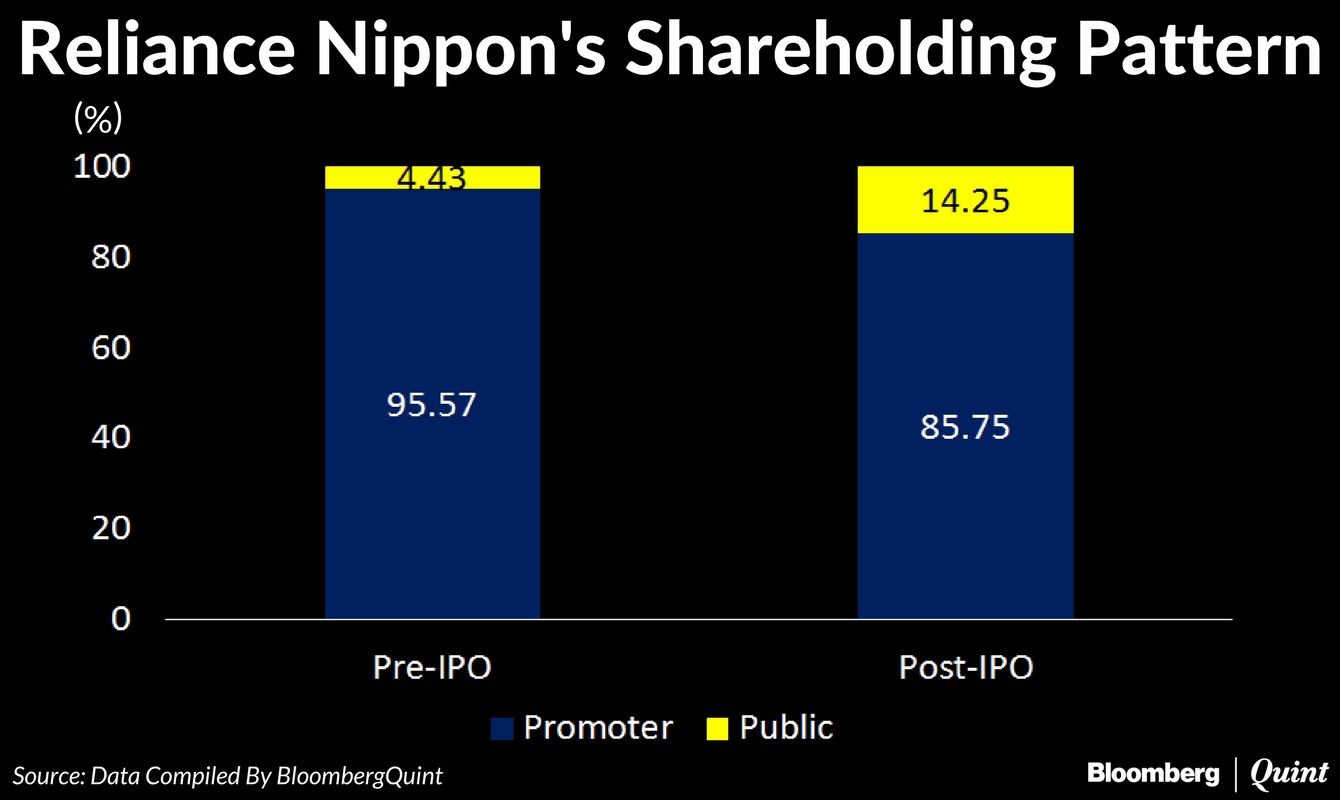 The joint venture between Reliance Capital Ltd. and Japan's Nippon Life Insurance Company Ltd. sold 6.12 crore shares at Rs 252 apiece in the IPO that was subscribed 81.5 times. The promoters and investors raised Rs 925 crore in an offer for sale. The rest came through a fresh issue.