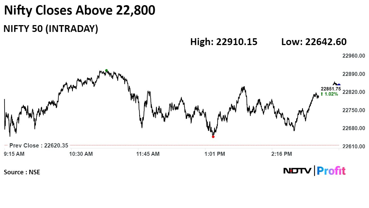 The Nifty closed 231.40 points up, or 1.02%, at 22,851.75, and the Sensex rose 692.27 points, or 0.93%, to end higher at 75,074.51.