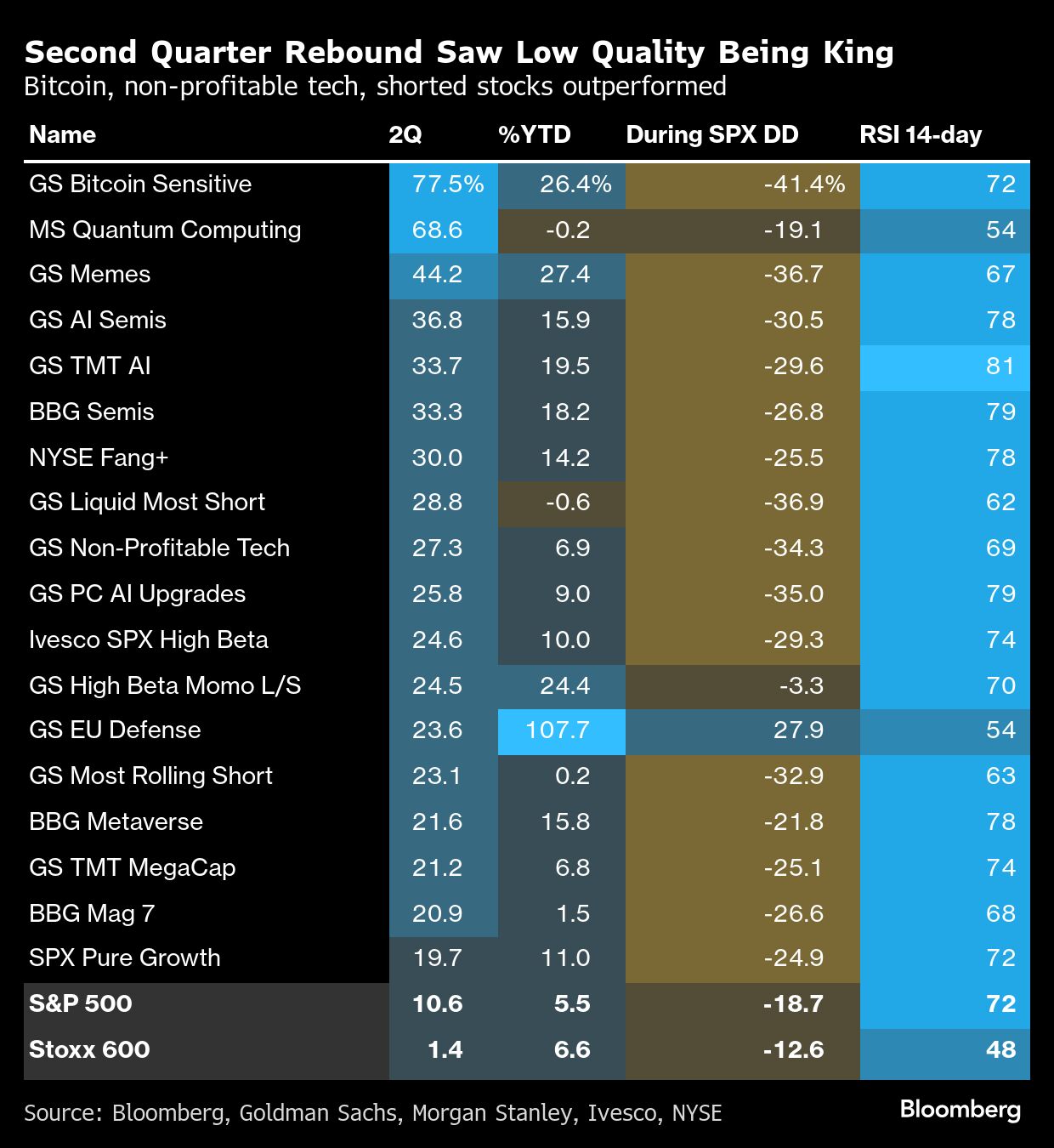 “The second quarter snap-back rally was led by the perceived lower quality baskets — the Dash to Trash,” said Mark Taylor, a sales trader at Panmure Liberum Limited. “This pointed to retail buyers continuing to buy dips aggressively and the pain trade of positioning flipping to performance chasing.”