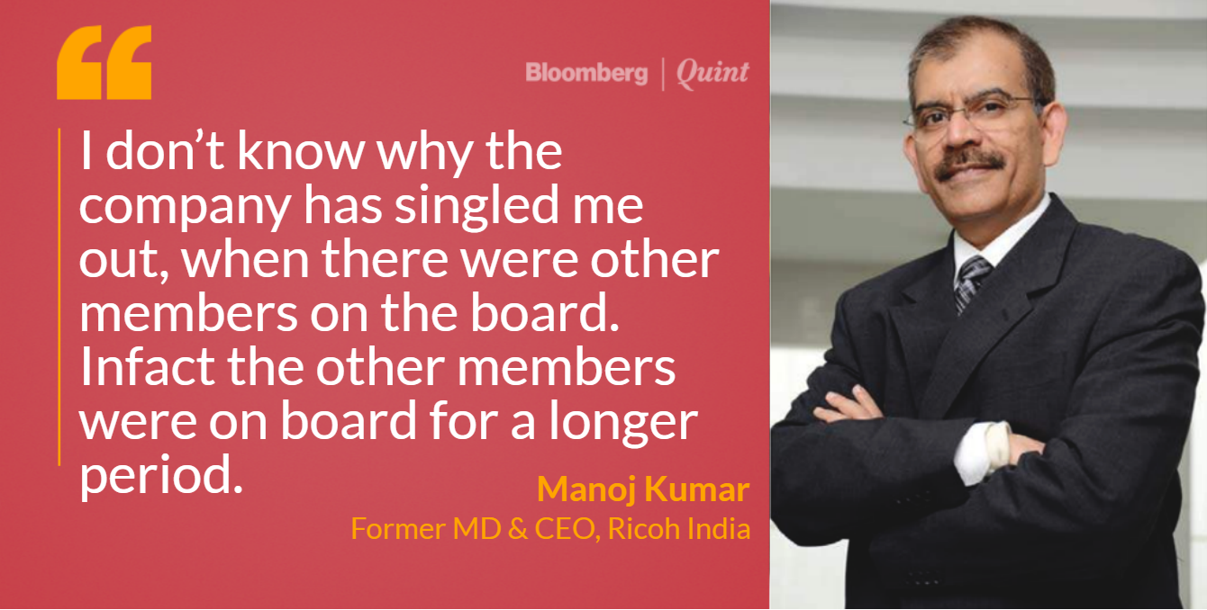 Since then Manoj Kumar has been replaced by another Ricoh India old-timer AT Rajan. Kumar has also been named in a petition filed by the Japanese parent at the National Company Law Tribunal seeking to investigate and punish those responsible for a Rs 1,123 crore fraud.