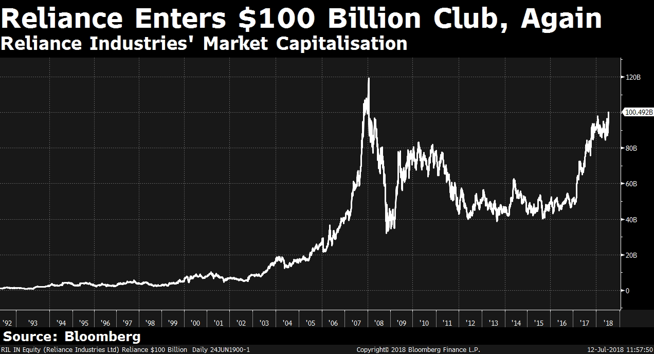 The country's largest oil-to-retail conglomerate had last hit $100 billion in market capitalisation on Jan. 18, 2008. The latest surge started with the launch of Reliance Jio Infocomm Ltd. in September 2016 that disrupted India's telecom industry with cheap data. RIL's market capitalisation has since doubled.