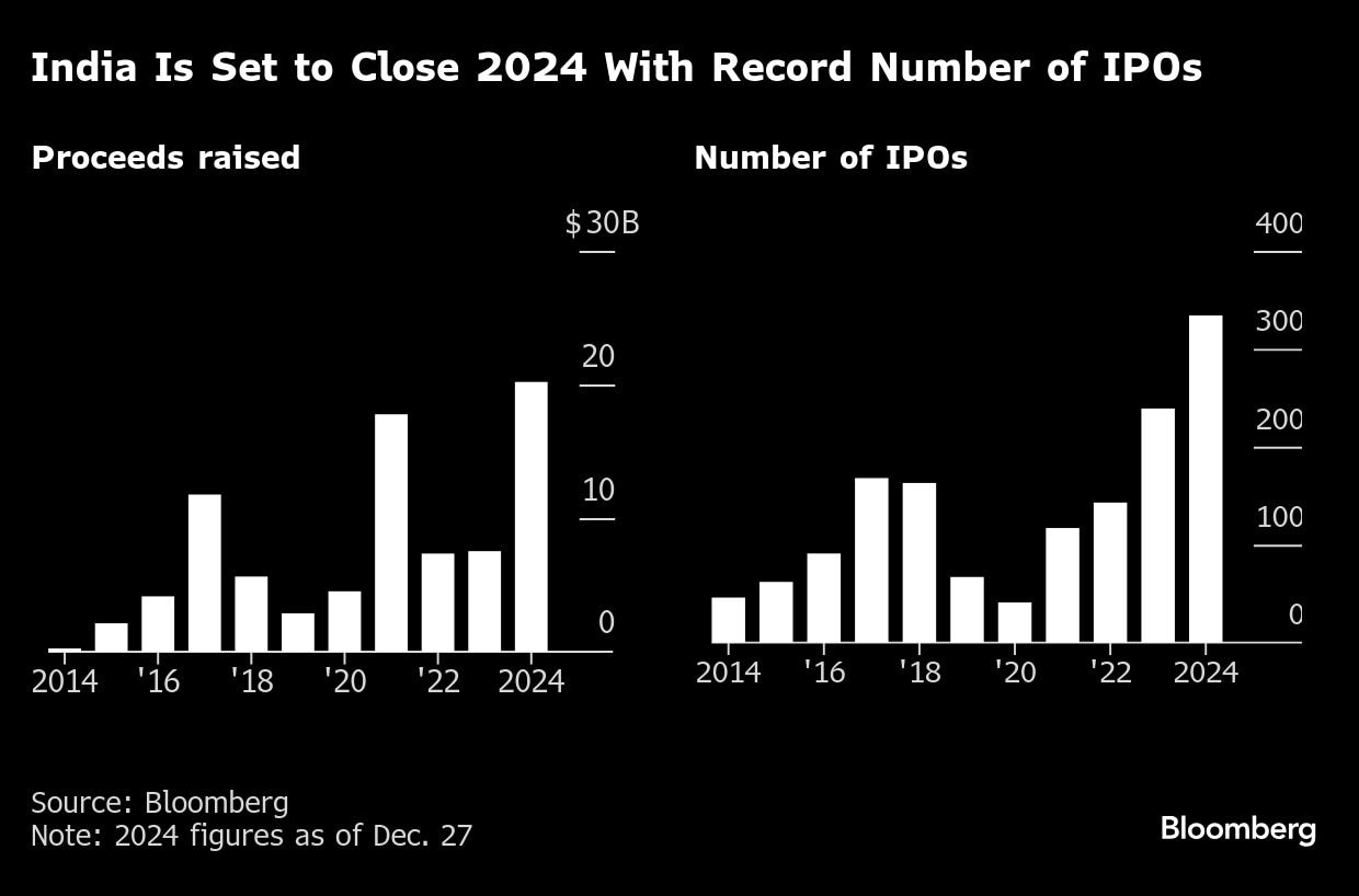 With six firms debuting on the bourses Friday and at least three more lined up for listing over the last two days of the year, India is set to close 2024 with a record number of IPOs and proceeds, according to data compiled by Bloomberg.