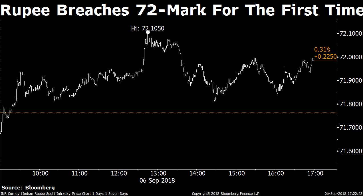 The Indian rupee crossed the 72-mark against the U.S. dollar for the first time, as weakness across emerging market currencies, rising oil prices and limited intervention from the RBI dragged the unit down further. The falling rupee, in turn, has pushed bond yields up with investors fearing the fallout of weaker currency on inflation in the economy.