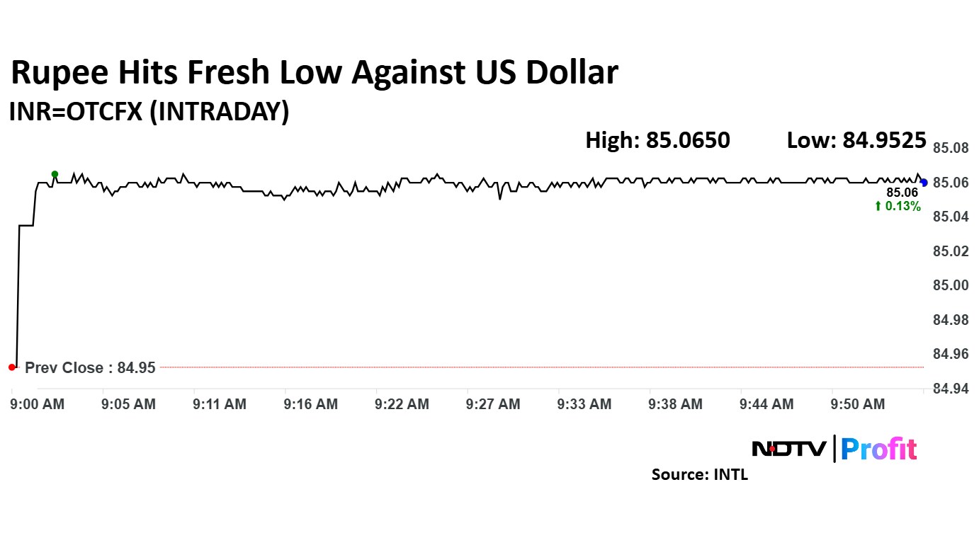 Rupee started the day 8 paise weaker against the US dollar at 85.04. However, high demand for the greenback took the Indian unit to a record low of 85.07 against the US dollar shortly after open, according traders in the forex markets.