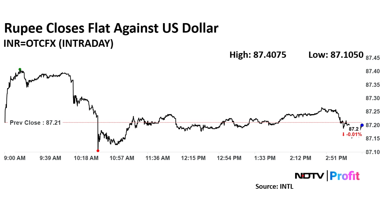 The Indian unit settled at 87.20 a dollar, unchanged from Tuesday's close, according to Bloomberg data. India's financial markets were closed Wednesday on the occasion of Maha Shivaratri.