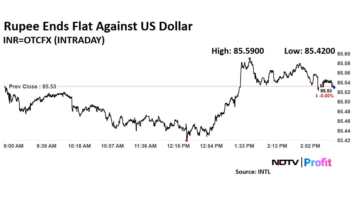 The Indian rupee ended the day flat at 85.54 against the US dollar on Monday, following a volatile trading session last Friday. The domestic currency had opened at 85.48, showing a gain of 6 paise from its previous close of 85.54.