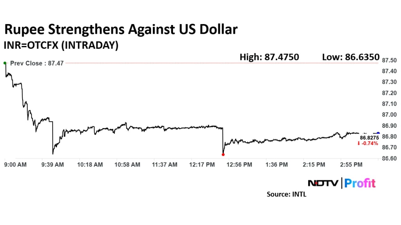 On Tuesday, the domestic currency strengthened against the US dollar as the central bank stepped in to stabilise the currency, traders told NDTV Profit. The domestic currency sustained its gains from the open, moving away from the 87-mark as the day progressed. Traders familiar with the development noted that the Reserve Bank of India has been heavily intervening in the market both yesterday and today.